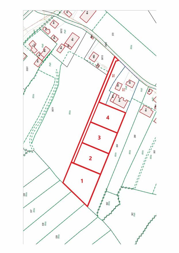Oferowane do sprzedaży działki zostaną wydzielone geodezyjnie z dwóch istniejących działek ewidencyjnych o numerach 565 i 566. Projekt podziału, dostępny w załączniku do oferty, przewiduje powstanie czterech parceli o powierzchniach od 18 do 25 arów: